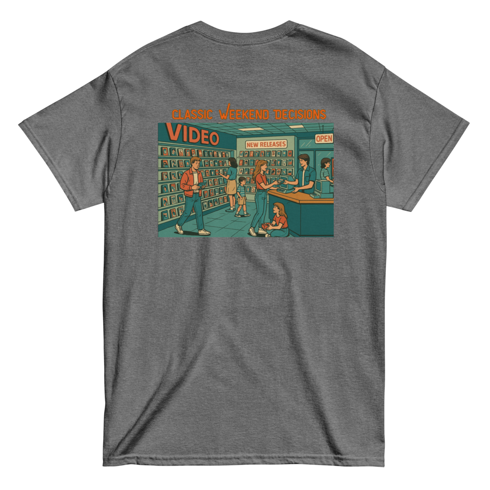 The Classic Weekend Decisions tee is a love letter to Friday Nights when Mom and Dad took us to the local video store, wandering the aisles under the fluorescent lights. It's for those who remember rewinding tapes, grabbing snacks and making movie night and event- no streaming, just stories to be told and memories made.